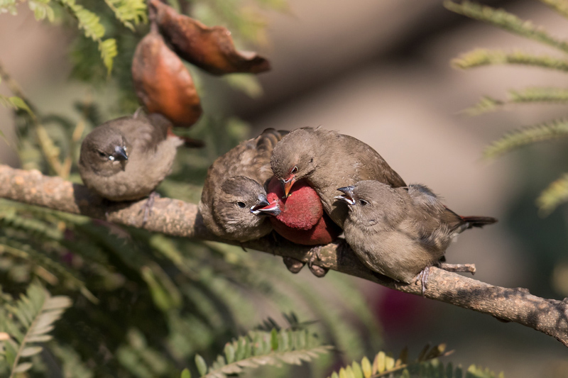 From left to right: Juvenile Red-billed Firefinch, Juvenile Village Indigobird, adult male Red-billed Firefinch, adult female red-billed Firefinch and juvenile Red-billed Firefinch.