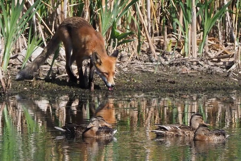 Beskrivelse: Ænderne ved tydeligvis, at ræven lider af vandskræk og lod sig ikke anfægte det mindste af dens tilsynekomst. Efter at have luret inde bag rørene i nogen tid, kom Mikkel frem og måtte nøjes med en tår vand.