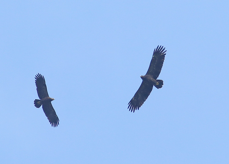 Beskrivelse: til venstre en Lille Skrigeørn, bemærk Stor Skrigeørns bredere hånd med længere fingre og sortbrune grundfarve med lys klamme o knoen.