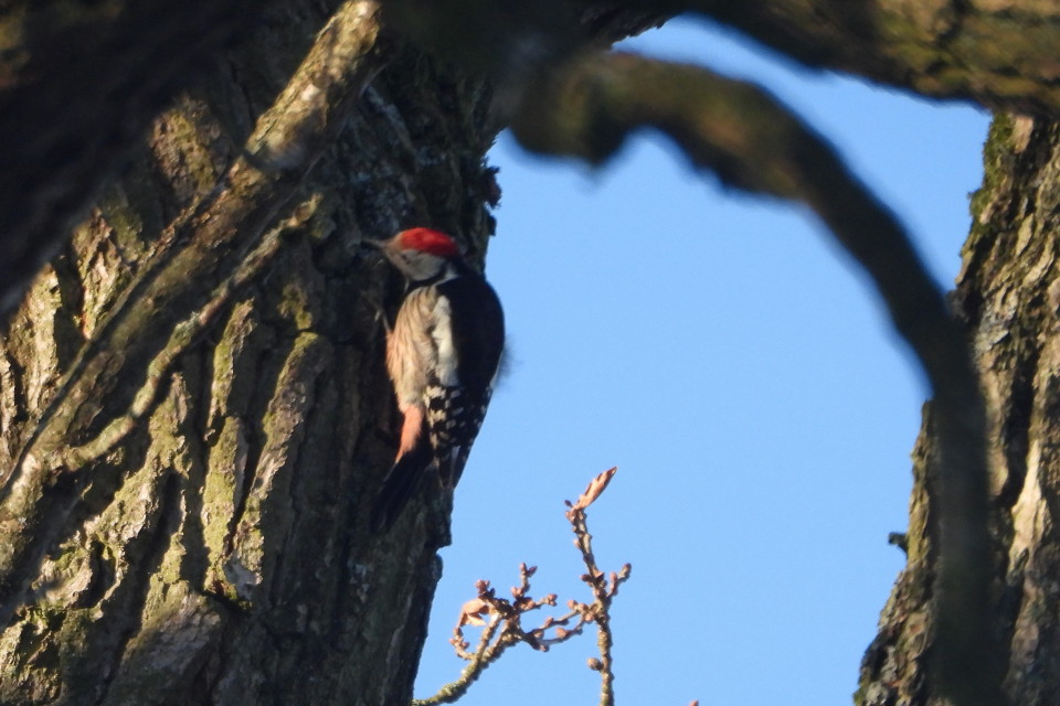Beskrivelse: Furagerede i de høje træer ved Slotshaven, meget ivrigt for så at flytte sig til andre træer.