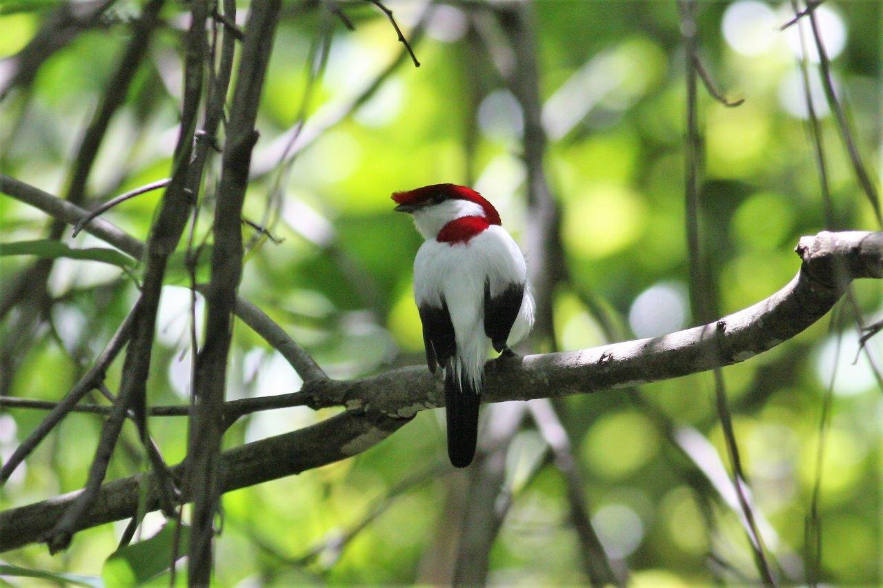 Den er nem at få at se. Man går ind ad en fin boardwalk i junglen, og flere hanner synger tæt på i øjenhøjde. Det var nærmest den første fugl vi så, da vi besøgte stedet.