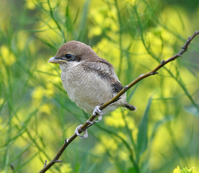 Beskrivelse: Et ynglende par Bull-headed Shrikes fangede og fodrede flittigt ungerne op med de mange trækkende småfugle.