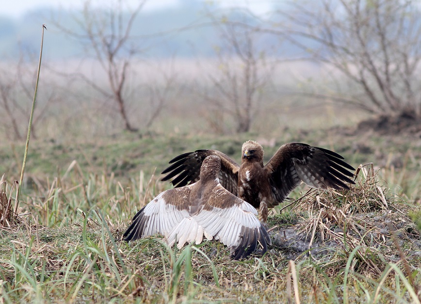 Beskrivelse: A confrontation between a Eurasian Marsh Harrier and a Booted eagle over the remains of a Common Coot.