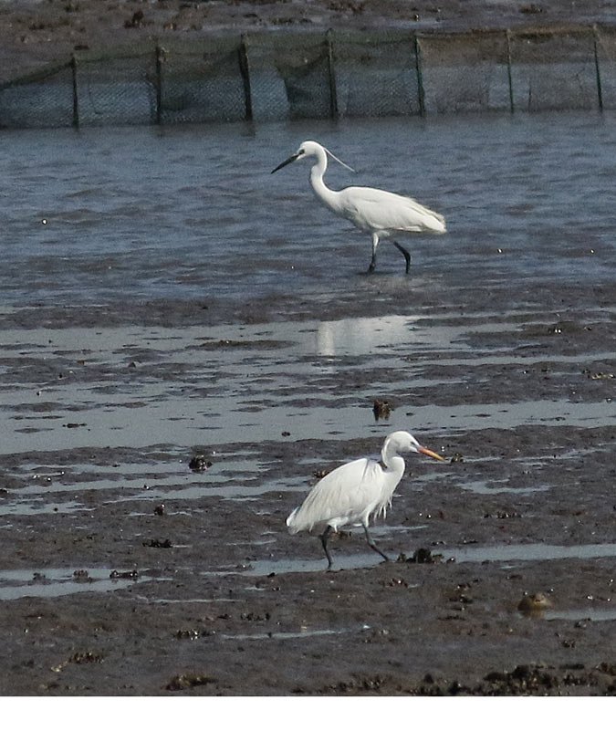 Beskrivelse: Chinese Egret i forgrunden, er en kende større end silkehejre i baggrunden, mere i jizzet ala Revhejre. Det gule næb samt yngledragtens pjuskede nakketop adskiller den fra silkehejren i baggrunden. Denne sjældne art med en verdensbestand på nogle tusinde, er et økologisk modstykke til Revhejren, og findes ved vadeflader langs kysten af det Gule Hav.