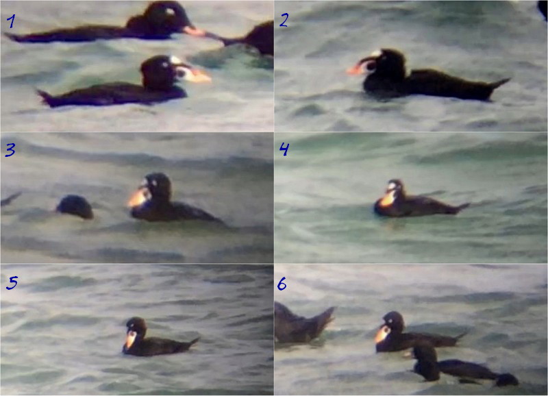 Billede 1 (15/8-2019) viser en han med stor pandeplet, reduceret plettet nakkeplet (dog svært at se på dette foto), samt noget afbleget næb. Billede 2 (16/8-2019) viser den flotteste han med stor pandeplet, reduceret renhvid oval nakkeplet, samt stort opsvulmet og relativt farvet næb, hvor næbryggens sorte befjedring når ud til næsebord. Billed 3-6 (15/8-2019) viser en han med stor pandeplet, reduceret spættet nakkeplet, samt mindre opsvulmet næb. Denne han kan godt være samme som den på billede 1. Der var yderligere en han med helt manglende nakkeplet og stærkt reducerede pandeplet.