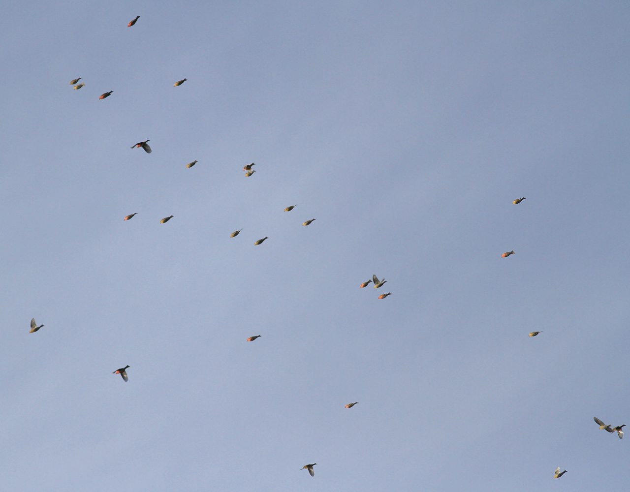Beskrivelse: Udsnit der viser 29 fugle ud af en flok på 31 fugle. I alt sås der 88 Krognæb på lokaliteten i dag, hvilket slår den gamle DK-rekord på 62 fugle 12/11-2012 samme lokalitet. Se mere på min blog <a href="https://birdingnj.blogspot.com/2019/10/i-habet-om-at-komme-fa-set-nogle-krognb.html">BirdingNJ</a>.