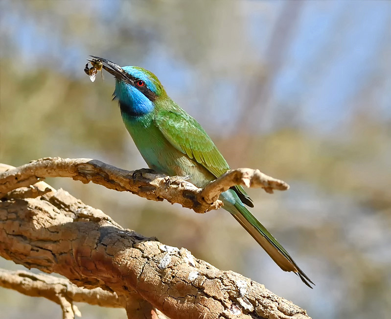 Beskrivelse: Slår grundigt og mange gange bien ned i grenen, før den spiser den.