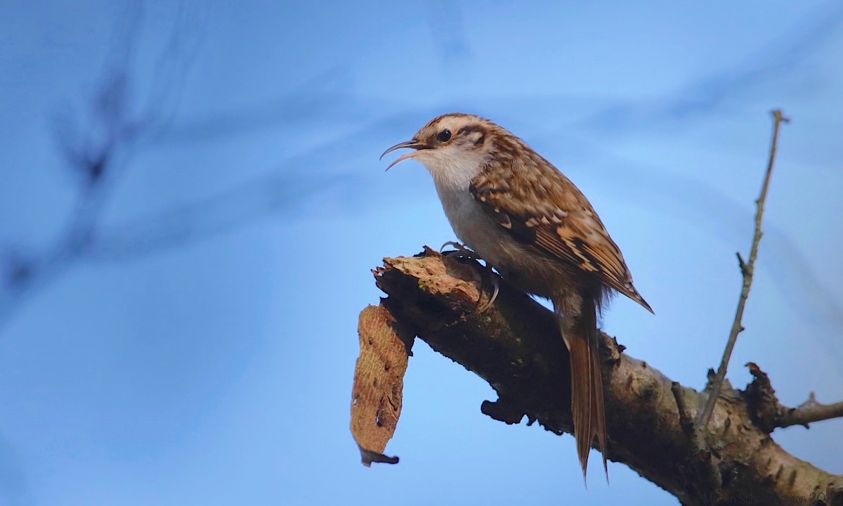 Beskrivelse: Træløber selvom den smudsig brune underside kan antyde Korttået Træløber. Men lang bagtå og sang sagde Alm Træløber