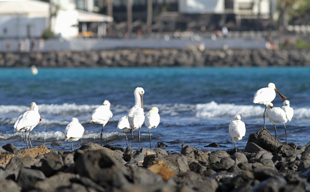 Beskrivelse: Et udsnit af 29 Skestorke som stod på Lavaklipperne ved Strand promenaden.