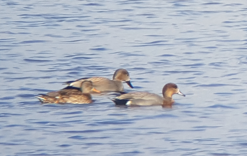 Beskrivelse: Hybrider mellem knarand og pibeand lader til, at være sjældne i naturen. I dette tilfælde en adult han, som holdt sig til knarænder.
