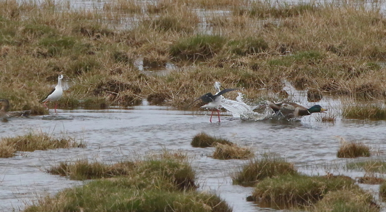 Beskrivelse: Begge stylteløbere ranker sig og løber truende mod to gråænder som hviler. Det lykkes at jeg først andrikken væk og derefter hunnen. Også stor kobbersneppe blev jaget på porten.