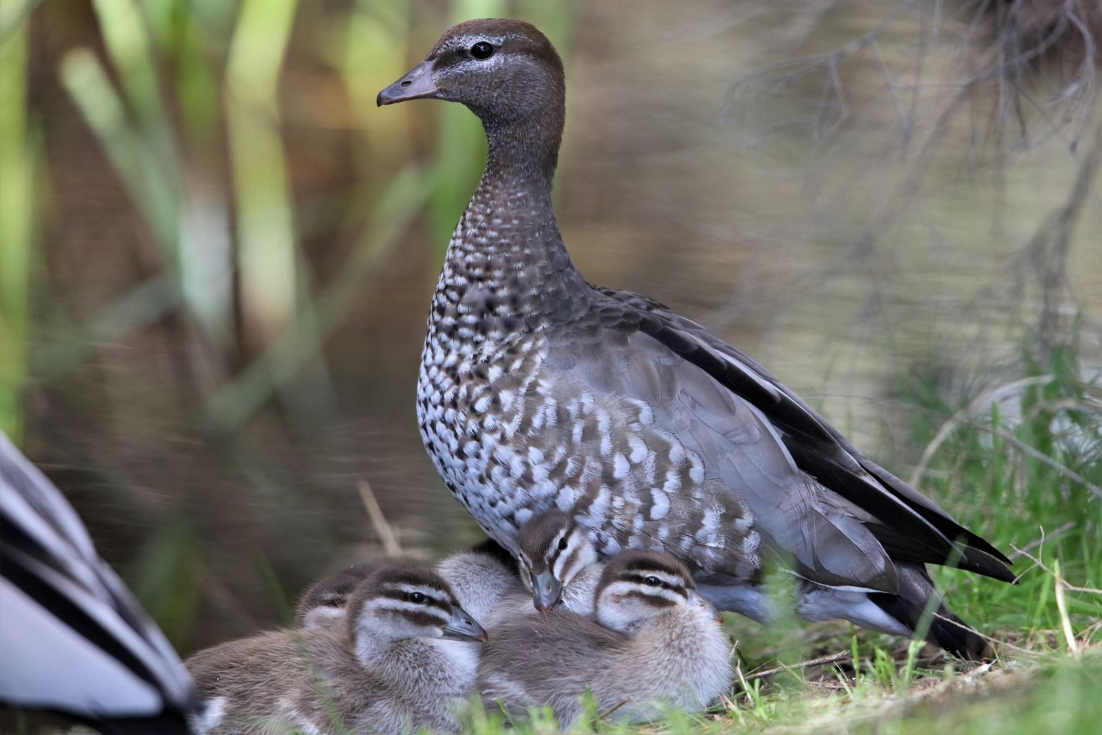 Beskrivelse: Both parents present, male shown partly to the left. Also named Australian Wood Duck - that name more commonly used locally.