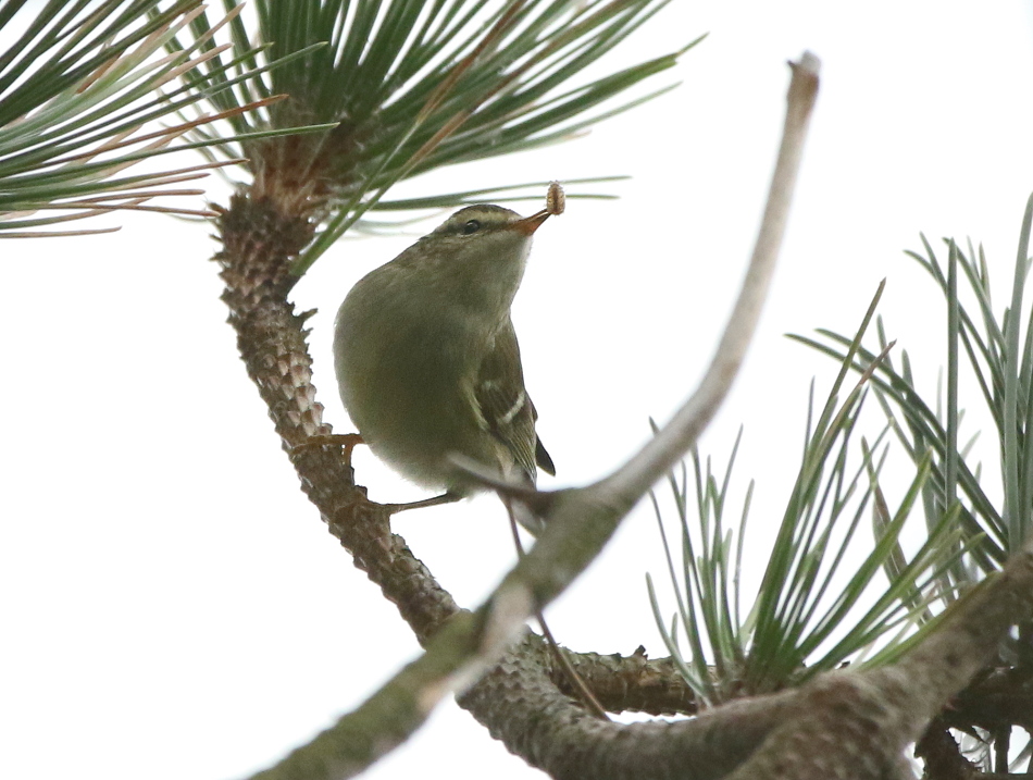 Beskrivelse: Genfandt først en hvidbrynet løvsanger ved Nørre Lyngvig Fyr. Ca. en time efter fandt jeg denne i de høje skovfyr i skellet til kirkegården i Hvide Sande.
