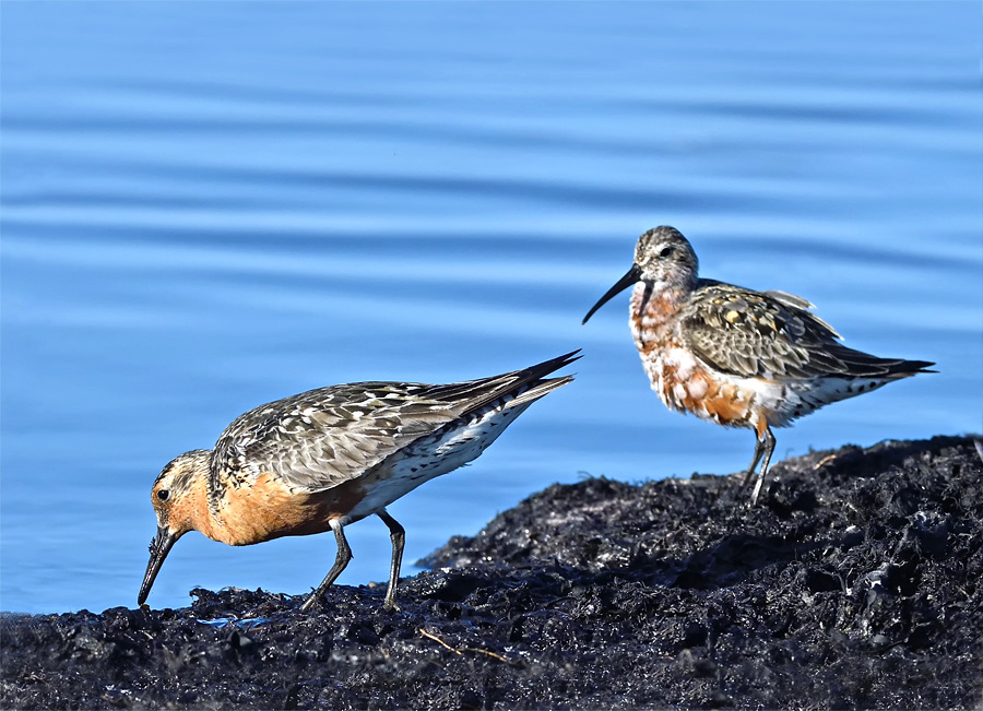 Beskrivelse: Trods værende i sene adulte sommerdragter ( med mange hvide fjer i den Krumnæbbedes th) , kan her netop anes forskellen på de to arters røde brystfarver i sommerdragt :