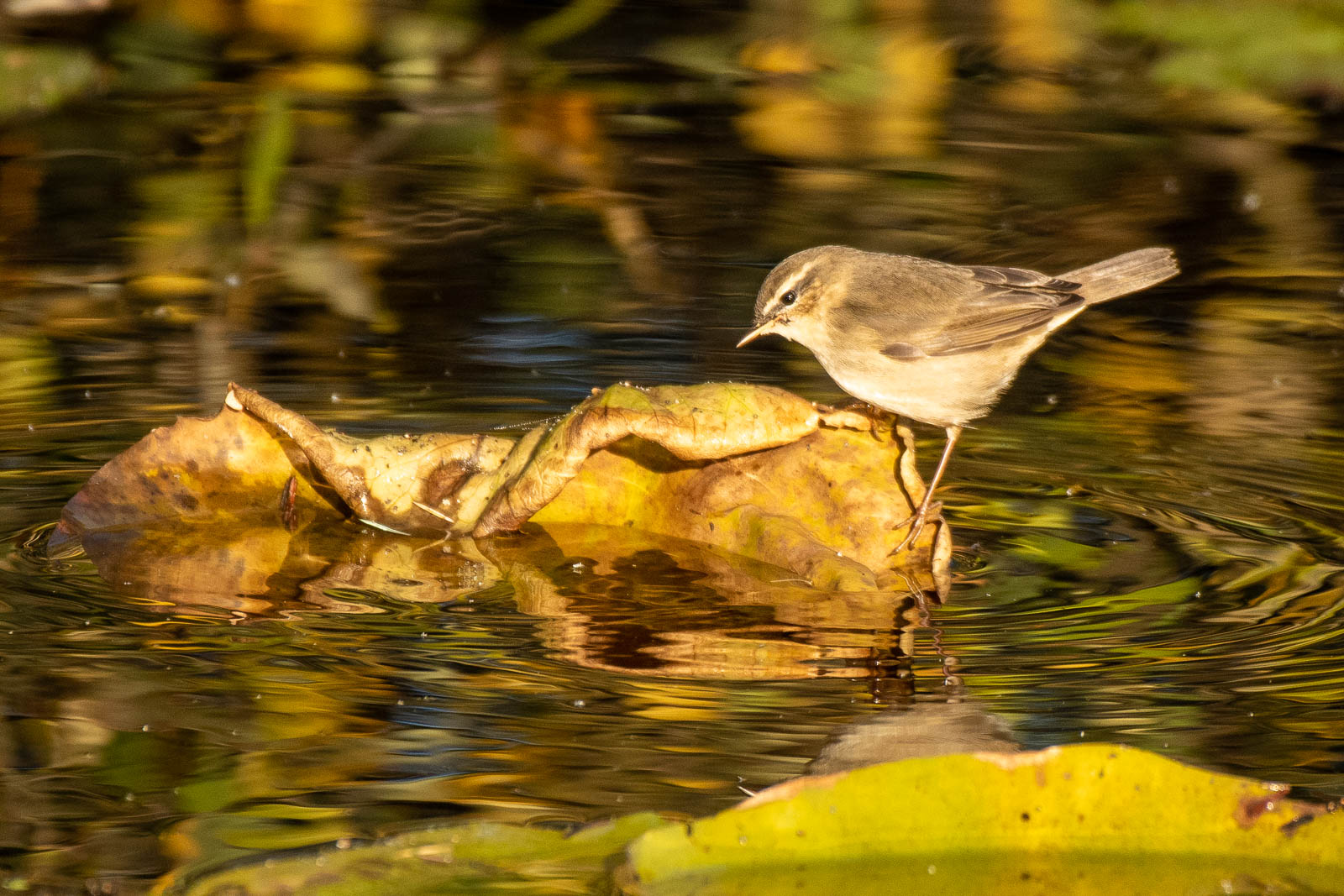 Beskrivelse: Brun Løvsanger fouragerer ved branddammen ved Blåvand Radiomast.