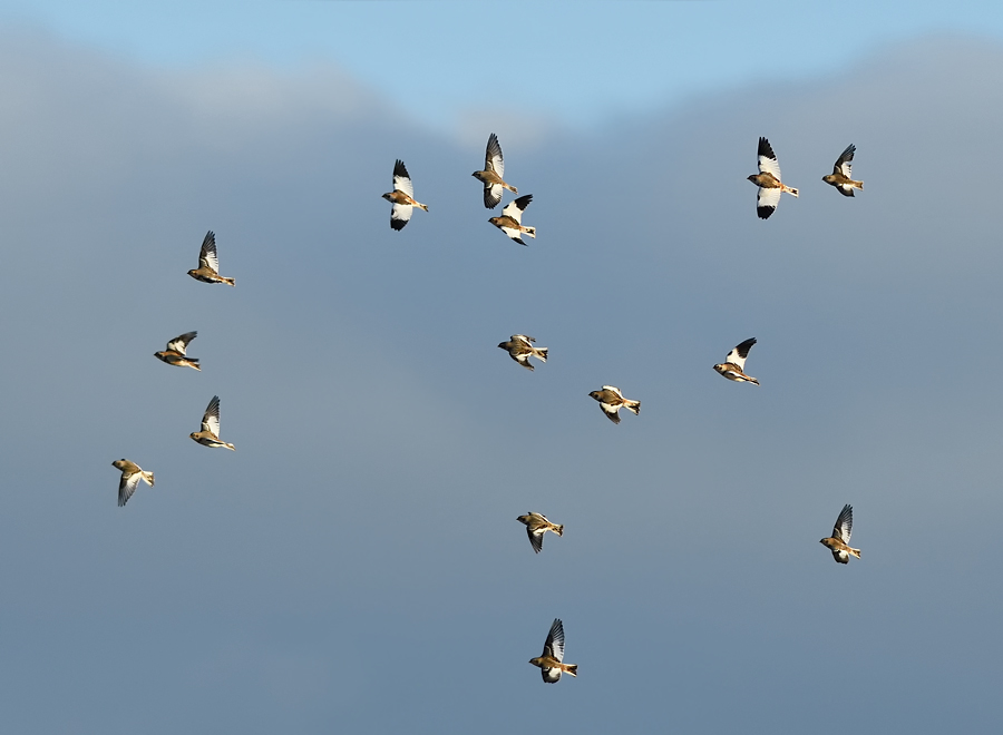 Beskrivelse: En mindre flok på ca 18 Snespurve har trods mange forstyrrelser nu holdt til ca en uges tid ved Fourfeltbækkens udløb i sandområderne.