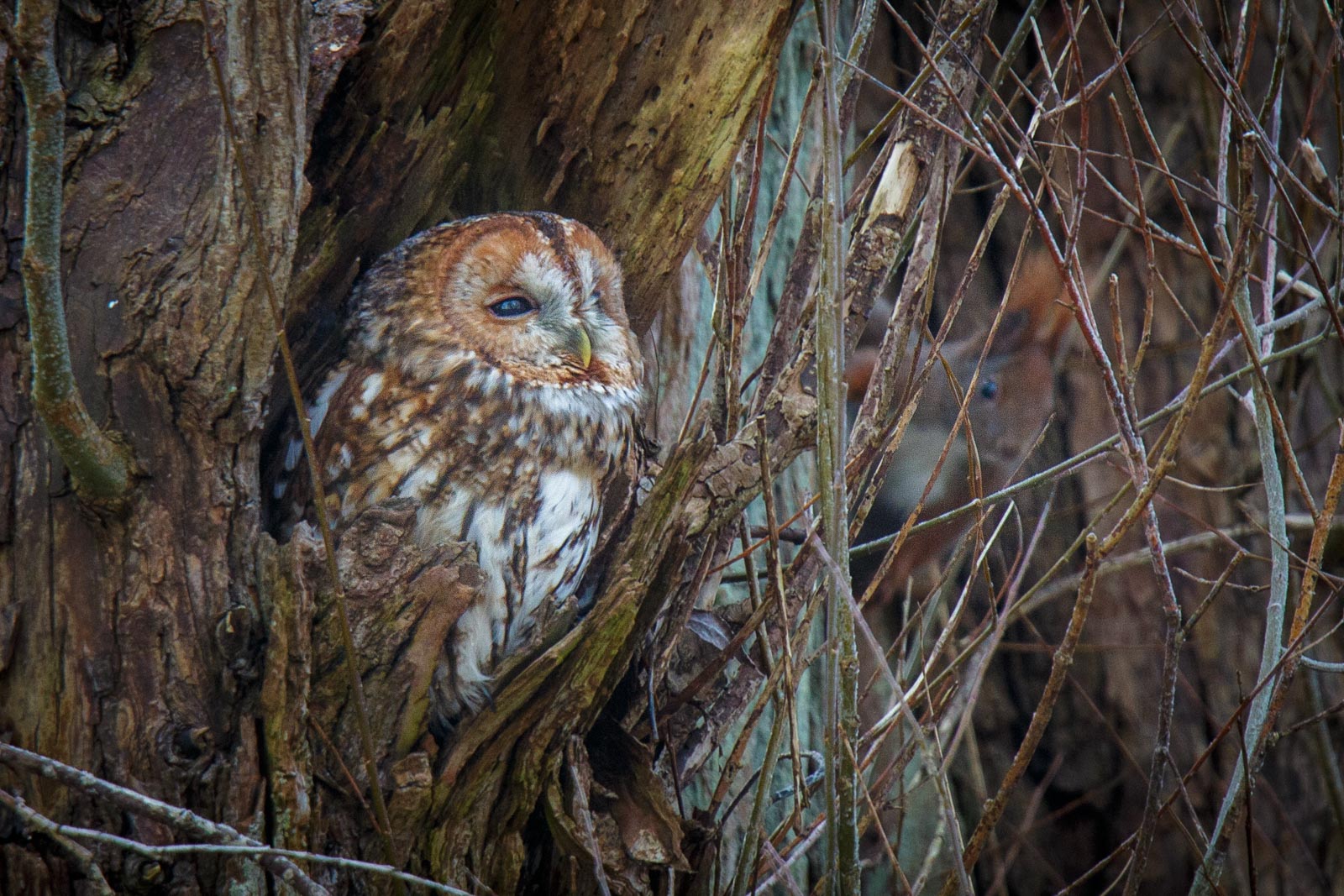 Beskrivelse: Natuglen trak sig kort efter tilbage i hullet, da egernet blev ved at kredse omkring den.