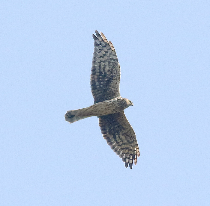 Beskrivelse: Det er en regel, at Blå Kærhøg har 5 synlige "fingre", mens Hede- og Steppehøg kun har 4. Som en forberedelse til efterårstrækket er det på sin plads at gøre opmærksom på, at denne regel IKKE gælder 100% midt på efteråret, hvor Blå Kærhøg er i gang med fældningen af håndsvingfjerene, og derved mangler den ekstra 5te finger. Oftest vil dette give sig udtryk i et "hak" i hånden eller en halvt udvokset fjer, men i særligt grelle tilfælde er væksten af de nye svingfjer på et så tidligt stadie, at man ikke bemærker den fremvoksende fjer, hvorfor der er risiko for, at en sådan fugl fejlbestemmes til Steppehøg. Den viste fugl er et godt eksempel. Der er formentligt tale om en 2K hun (ret mørke indre armsvingfjer), og ved første øjekast ser den fin ud for Steppehøg, omend noget kraftigt båndet på krop og hånd. På den nederste vinge ser man akkurat en fremvoksende håndsvingfjer mellem 3dje og 4rde finger, hvilket gør fuglen til en Blå Kærhøg. Flere hunner af arten denne dag viste ligeledes kun 4 fingre, men alle var i et mere let gennemskueligt stadie af håndens fældning.
