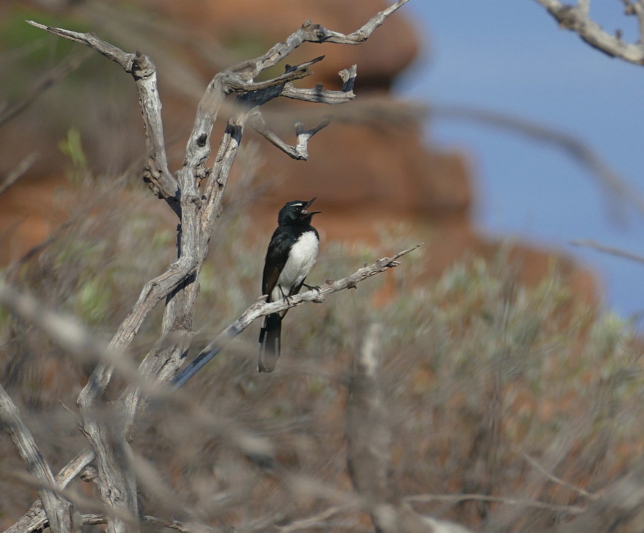 Beskrivelse: Selv om Willie Wagtail er en af de mest elskede havefugle i Australien, er den også udbredt i den 'rigtige' natur i bushen.