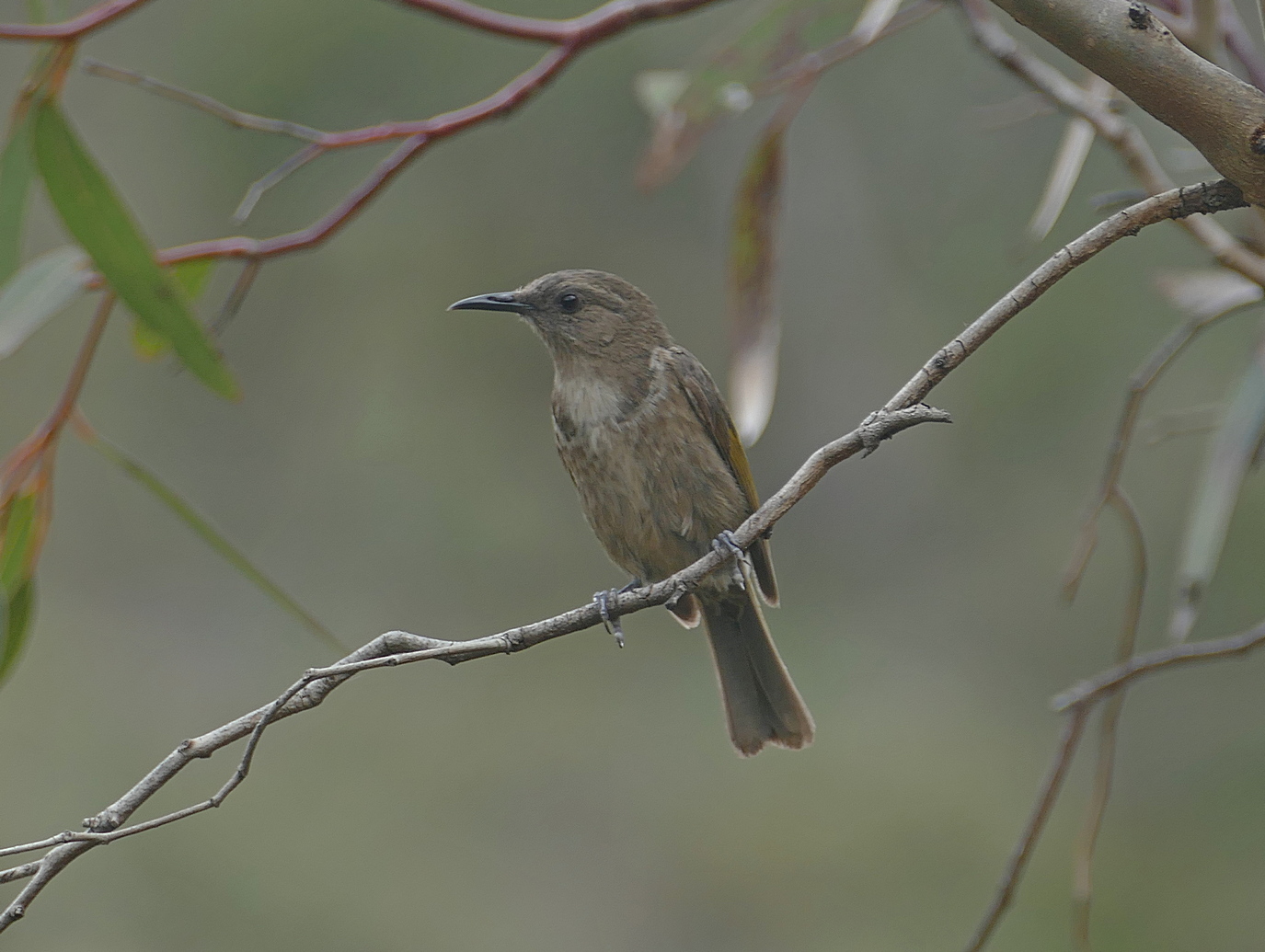 Beskrivelse: Hunnen af Crescent Honeyeater viser kun en ganske svag aftegning af halvmåne på siderne af brystet i forhold til hannen.