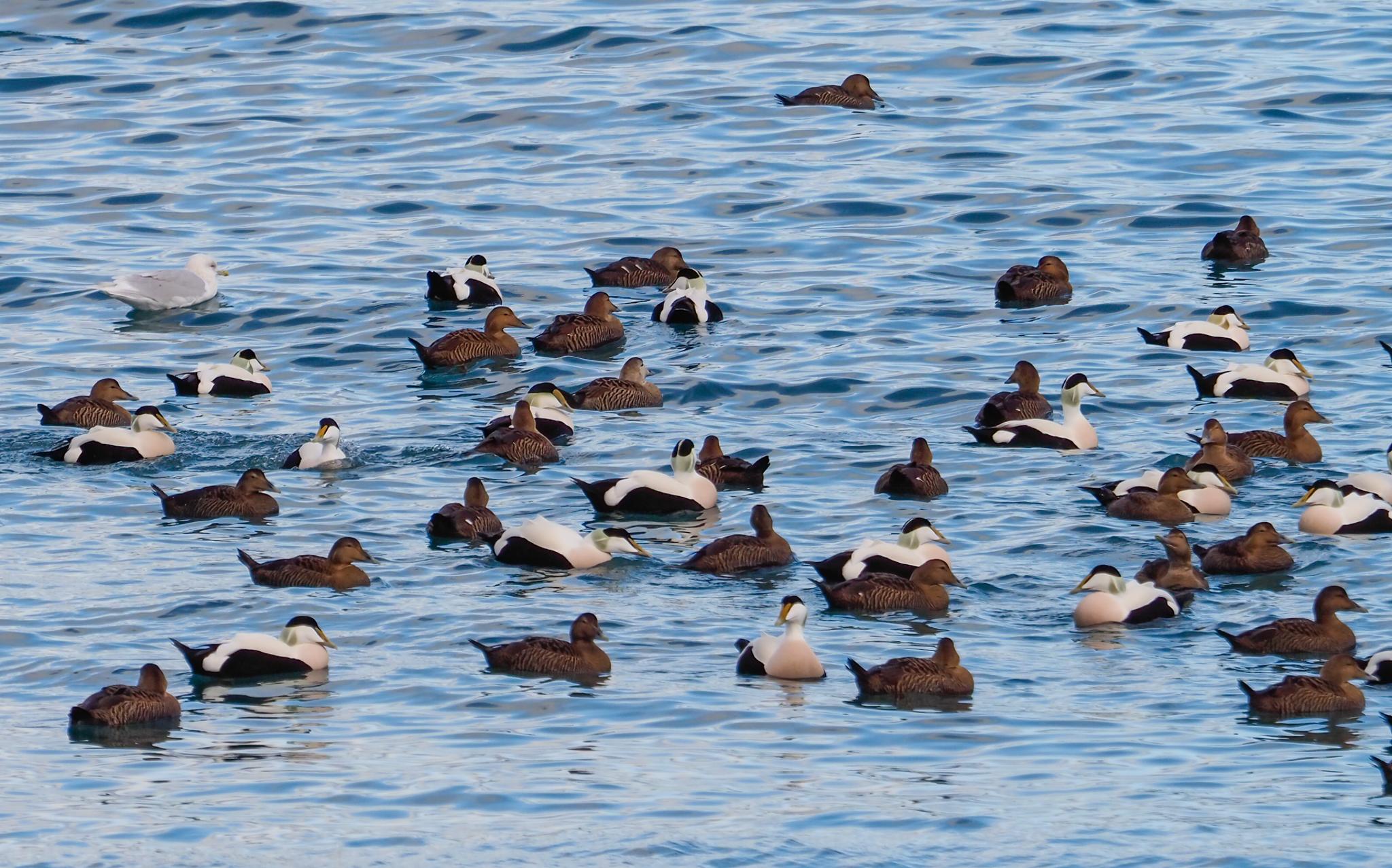 Beskrivelse: Første fund af racen i Island og blot andet fund for Vestpalearktis. Fuglen ligger akkurat til venstre for midten af billedet. De øvrige ederfugle er af racen borealis.