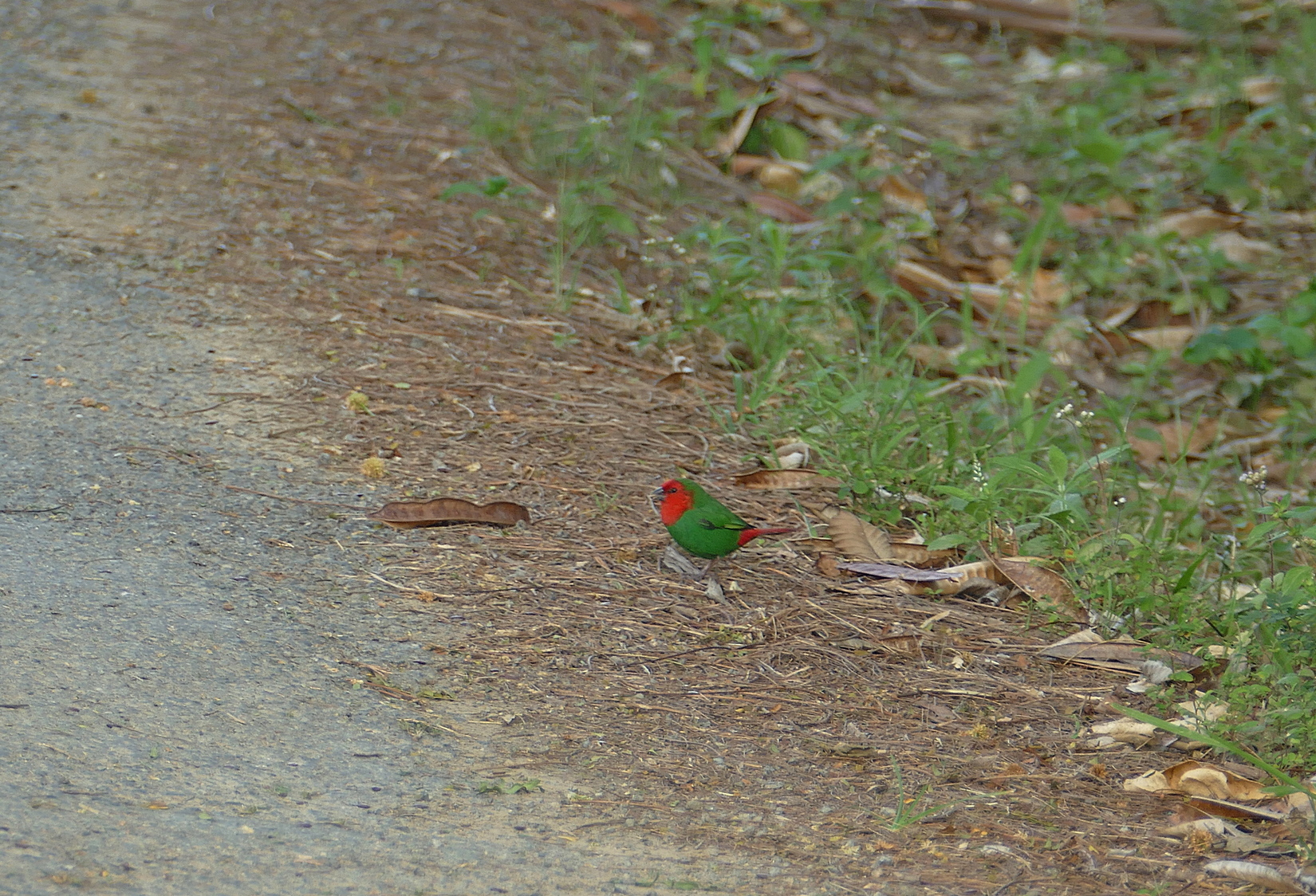 Titel: Red-throated Parrotfinch feeding at the roadside.