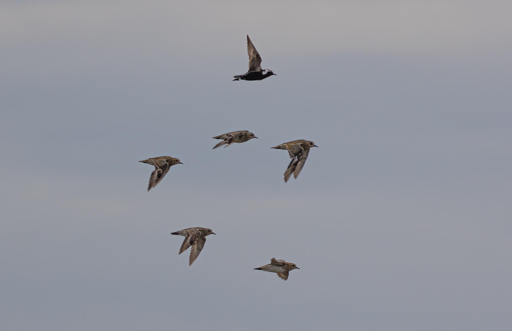 Beskrivelse: Amerikansk hjejle flyvende sammen med 5 alm. hjejler. Tydelig mørk undervinge.