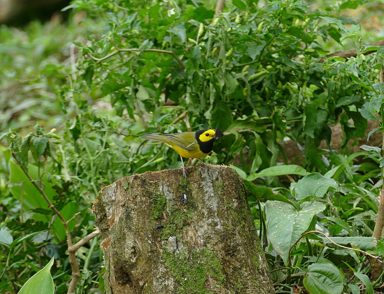 Beskrivelse: Hooded Warbler fouragerer tæt på jorden, og kan på trods af sine klare gule farver være svær at se, når den hopper rundt mellem planterne.