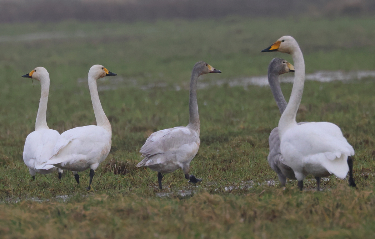 Beskrivelse: Pæd foto: En pibesvanefamilie og 1 adult sangsvane.