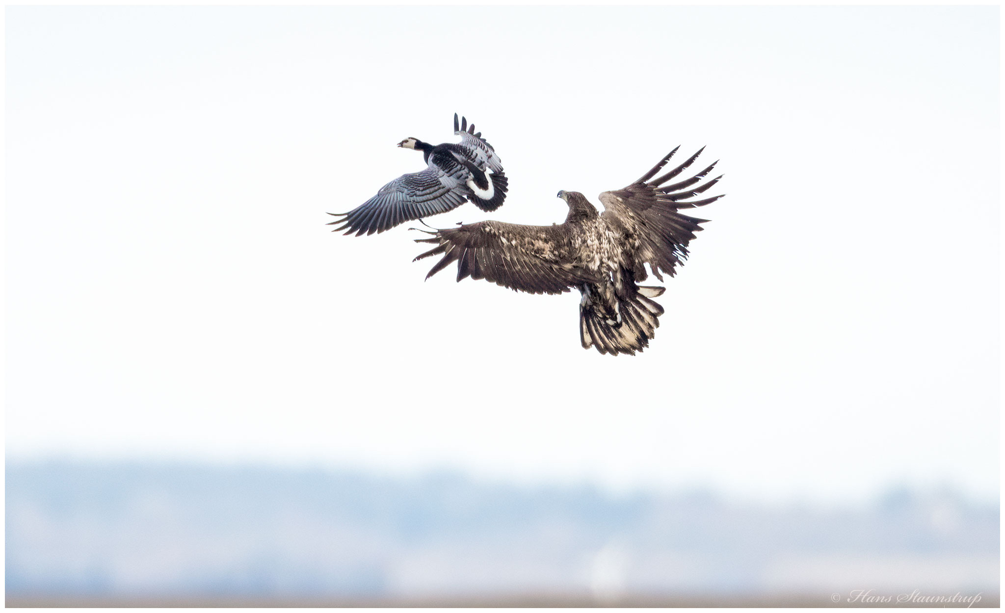Titel: Havørn 1/10 sek før den sætter en klo i bramgåsen