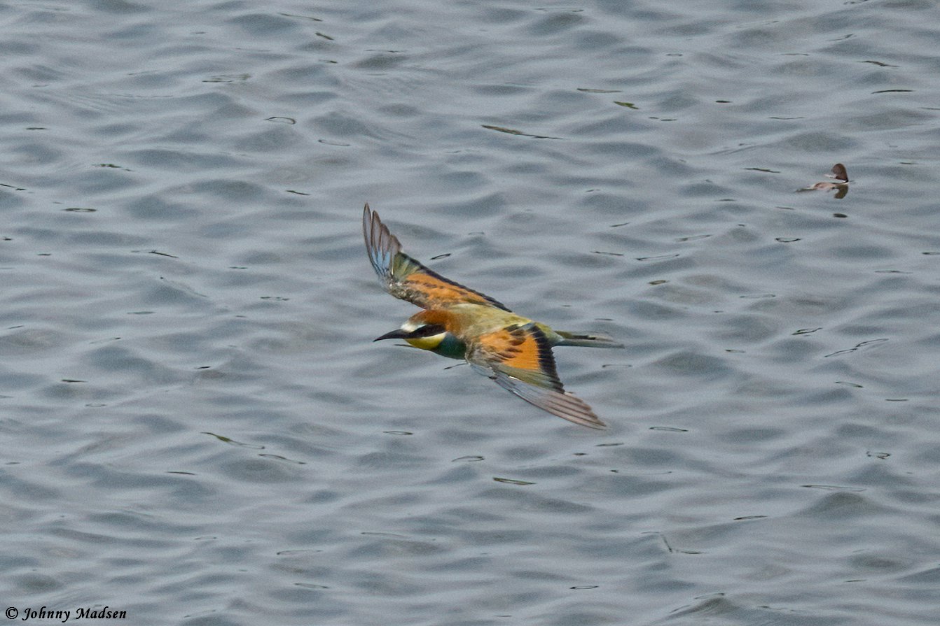 Beskrivelse: Denne biæder har mørke bånd på armsvingfjerene. Er det normalt? Jeg mener ikke, at jeg har set det før. Det ligner en ungfugl med den grønlige ryg, men de plejer vel heller ikke at have de mørke bånd?