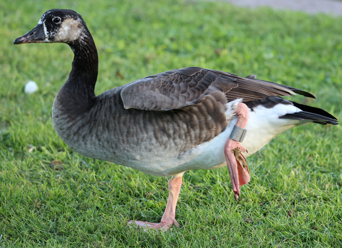 Beskrivelse: DKC 3900918. A. canadensis x A. anser; male at least 5½ years old, ringed at Sortedams Søen as an adult bird, 2½ years ago - and now seen again less than 5 km from location where getting the ring.