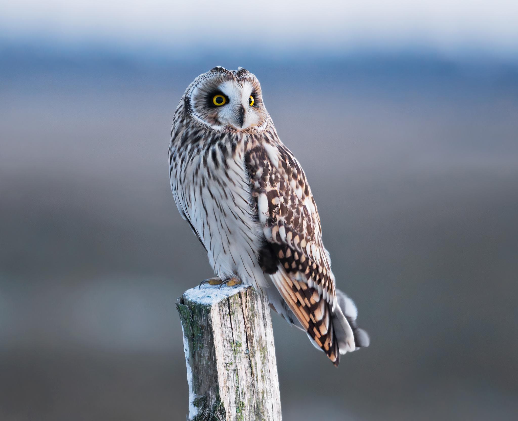 Beskrivelse: Billede af en rastende Mosehornugle i den blå time. Fotograferet på ISO 5000