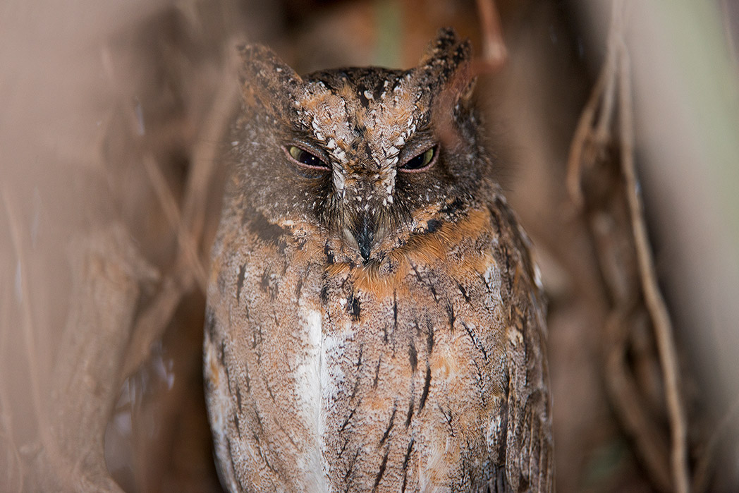 Beskrivelse: Uglen er klar tl udflyvning og venter kun på nattens fremskridende, ca. 1/2 time senere.