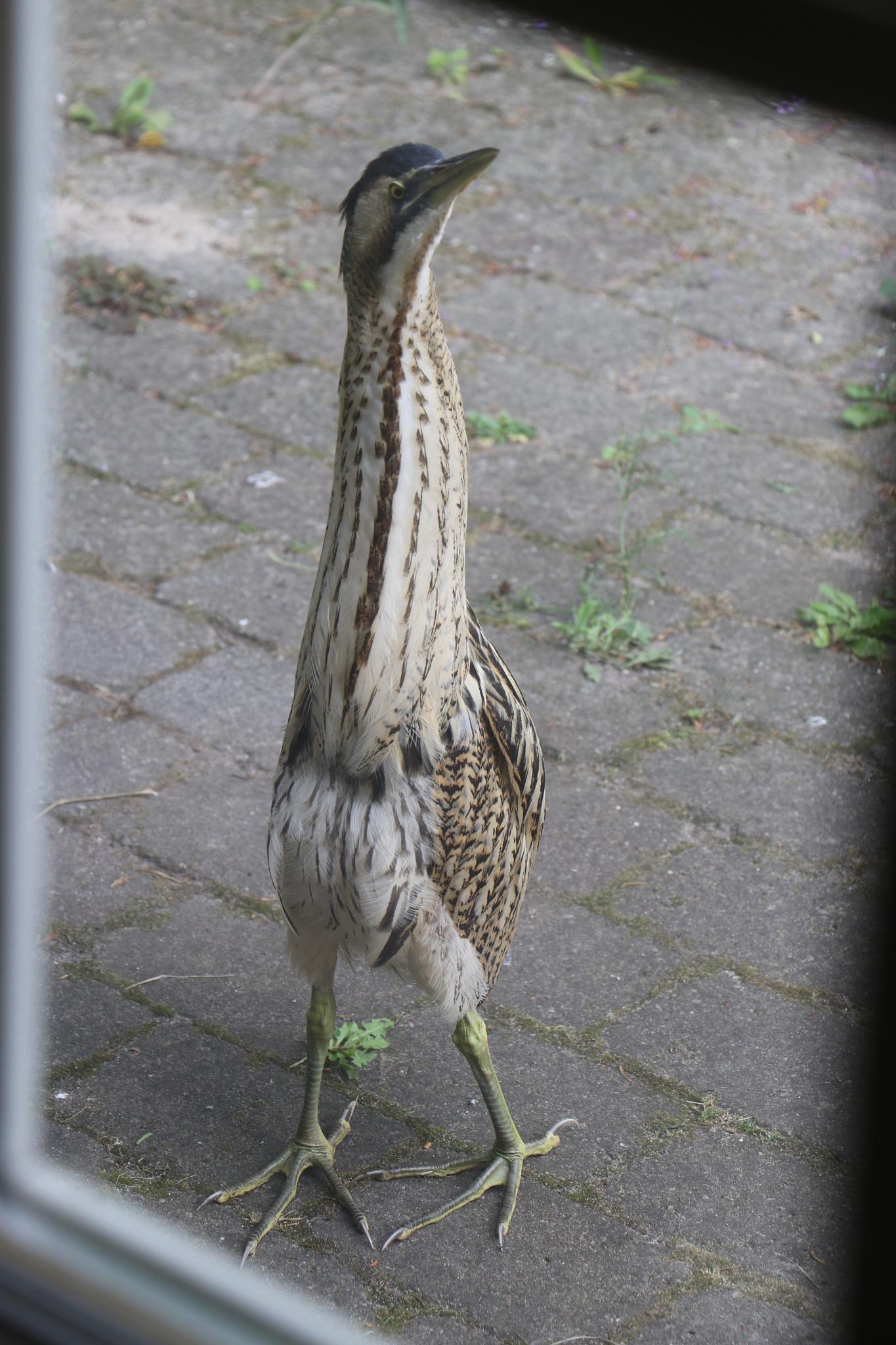 Beskrivelse: Et par små bank på køkkenvinduet viste sig at være en rørdrum (Botaurus stellaris), der ville ind i køkkenet. Det kunne den ikke, så den måtte nøjes med at gå over til havedammen og fiske lidt. Videoklips: youtu.be/RVBlIn7Wmr0 og youtu.be/MJ6YDZVsZeE