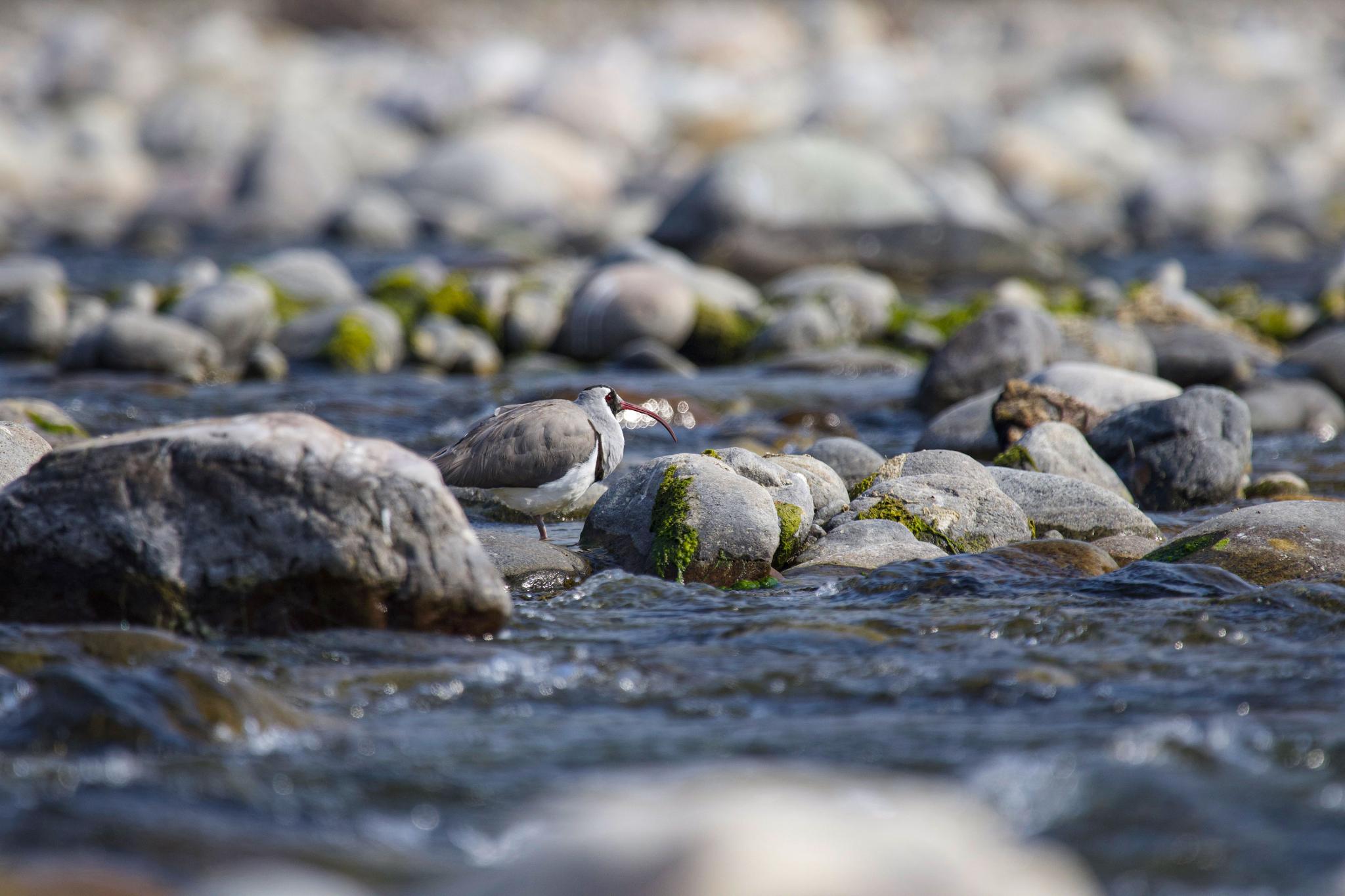 Beskrivelse: Fuglen blender godt ind i den store mængde afrundede sten i Kosi-floden