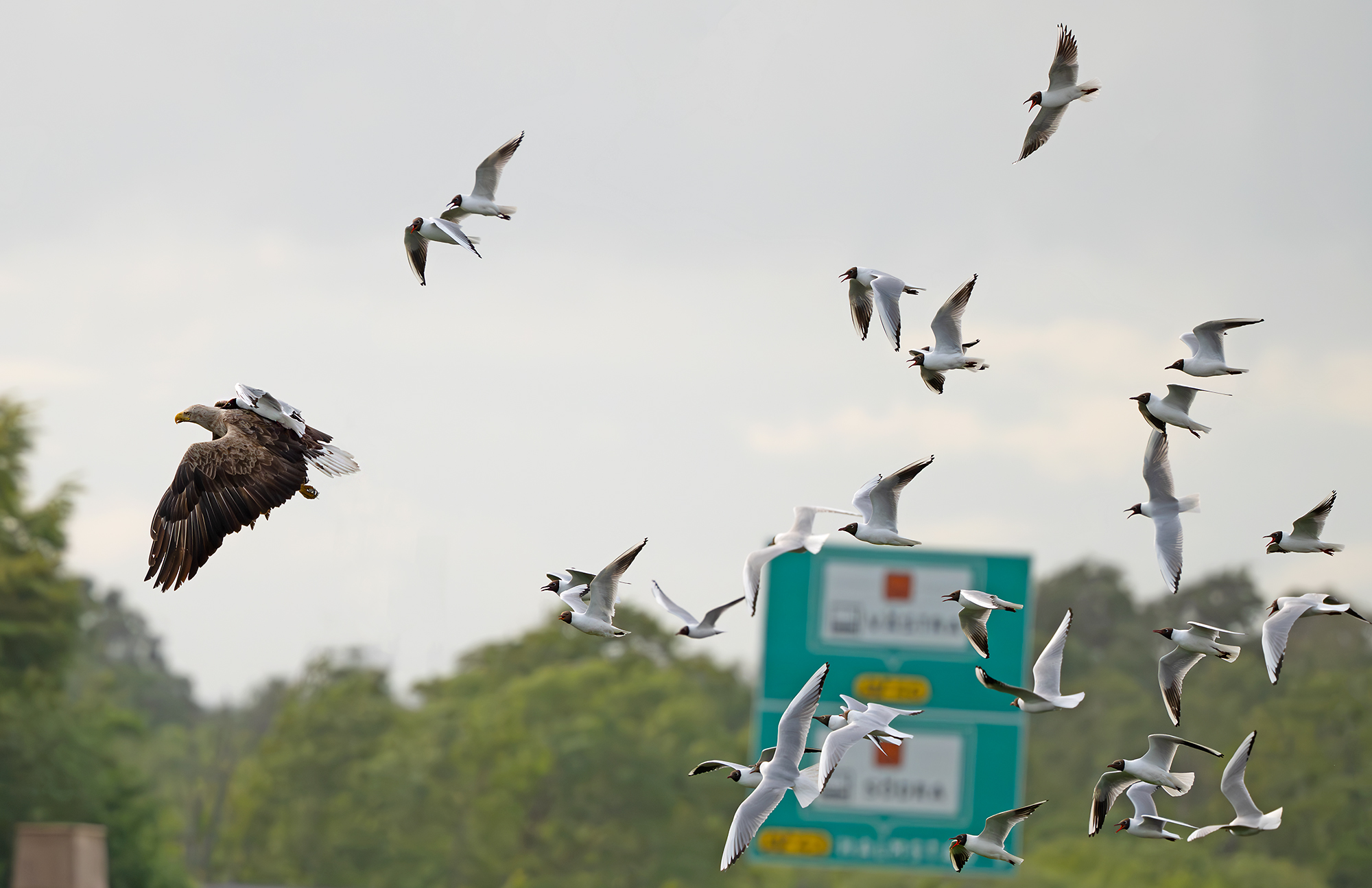 Beskrivelse: Den upopulære Havørn fik samtlige rasende Hættemåger på vingerne, hvor den mest arrige Hættemåge dykkede ned i Havørnens halsfjer.