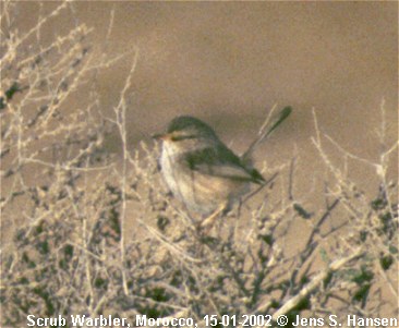 Beskrivelse: On a two week birding trip to Morocco a pair of Scrub Warblers was observed 15 km south of Goulimime at GPS: N 28 degrees 54.249, W 010 degrees 09.986.