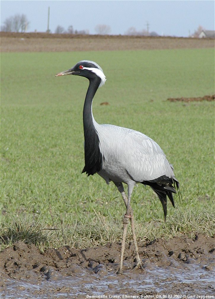 Beskrivelse: A very surprising bird on a Danish field in midwinter! This bird wore a ring and is surely an escapee. The ring could only be seen at a distance less than 150 meters. The bird was probably first seen January 31st when a "crane" flew south only a few kilometers to the north of the field where it was found February 2nd. This bird showed a very tame behaviour and it was possible to come as close as 2 meters.