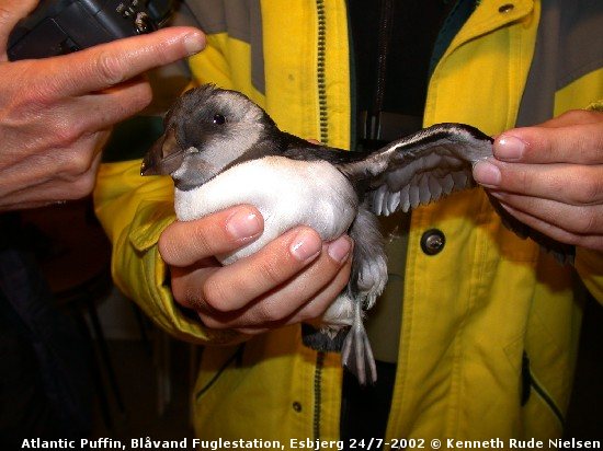 Beskrivelse: This 1cy Atlantic Puffin was found exhausted on the beach by some German tourists and brought into care at Blåvand Bird Observatory.
