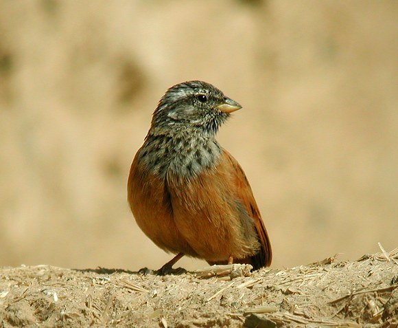 Flot billede af en meget almindelig og tillidsfuld Nord-vest-afrikansk standfugl. Kan godt se at billedet er taget i 2001, hvor Husværling Emberiza sahari og Stribet Værling Emberiza striolata nok endnu ikke var adskilt som 2 selvstændige arter omend de adskiller sig betydeligt. Fuglen på billedet er en fin Husværling... Det ku være fint, hvis fuglens art kunne rettes til dette...