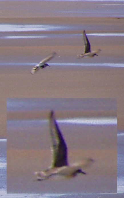 The flight pictures look good for Lesser SP as there is less black on the edges of the primaries and secondaries. The forehead of the bird looks black and lacks the amount of white that lechenaultii Greater SP should have for example visible on this distance. The bird looks slender instead of the bulky appearance normal for Greater, bill is short good for Lesser Sand plover of the western races, head is rounded etc. In flight the feet seem not to be completely stretched, but when stretched should get over the tip of the tail, and a good mark for the ID of Lesser SP.