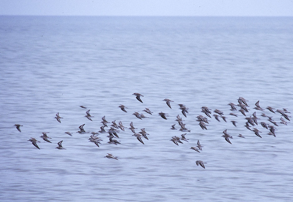 Beskrivelse: Mixed flock of <b>Greater Sand Plover</b> and <b>Lesser Sand Plover</b>.