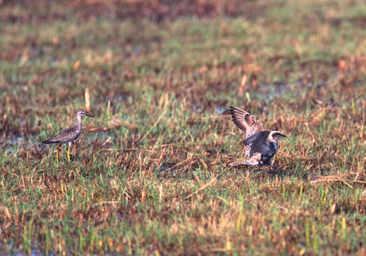 Amerikansk har ofte en hvidplettet overside; der kan være spredte gule fjer, men typisk er blot overgumpen tydeligt gulplettet - hvilket ses her, og på et foto i samme serie af en flyvende adult. Der står en Gulbenet Klire i baggrunden til venstre.