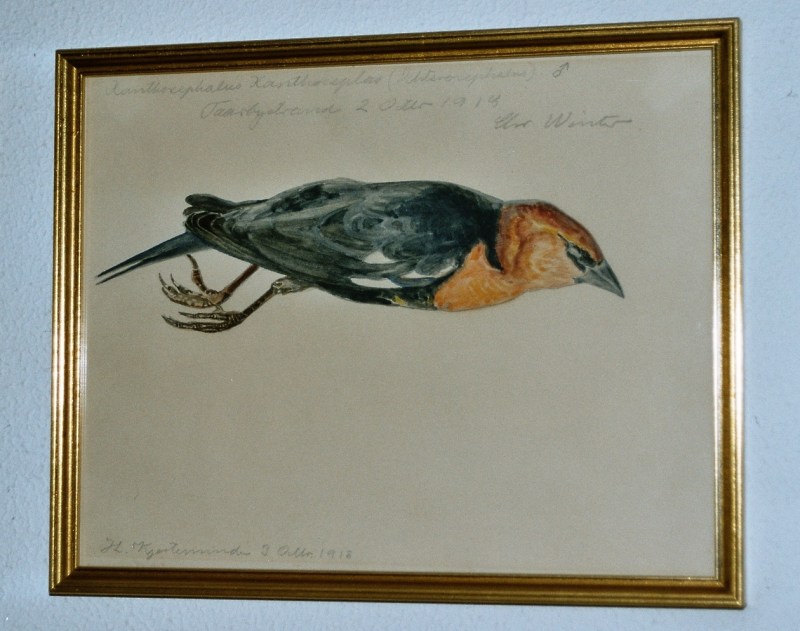 Beskrivelse: Gulhovedet Trupial, han malet af "fuglemaleren" Johannes Larsen. Billedet hænger i dag på Johannes Larsen-museet i Kerteminde.