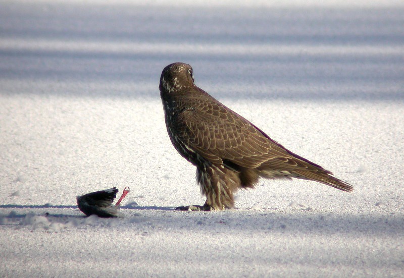 Beskrivelse: Fuglen rastede i Hørsholms lokale dam fra ca. 11:00 – 11:15, hvor den sad på isen og åd en Stormmåge. Da Jeg kom (11:10) havde den ædt hele fuglen på nær en halv vinge, så fuglen må havde rastet omkring en halvtime før jeg kom, afhængig af hvor lang tid den har været om at æde den. /Simon Berg Pedersen