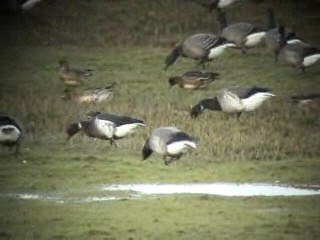 Beskrivelse: Man ser den Sortbugede Knortegås til venstre, en Mørkbuget Knortegås i midten og så en Lysbuget Knortegås i baggrunden.