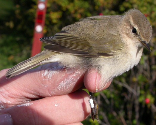 Beskrivelse: fugl 1: Den 8-10-04 fandt jeg denne (tristis) gransanger ved mit ringmærkerkrat, den blev obset en del gange spredt over en time, inden den fløj i et net. Kaldet blev ikke hørt i felten, men mange gange da vi havde den i hånden. Kaldet blev optaget på video. Følgende mål er taget på fuglen: Vinge 55mm Hale 54mm Næb: spids til skull 11,2 mm. spids til nostil 5 mm 1p = 7mm distance 1p til 2p = 22mm 2p= 8 8/9 Hele fuglens underside var lyshvid/buff uden antydning af gult. Ej heller var der, det mindste gult i øjenbrynsstriben. Det eneste gule på fuglen var ved vingeknoen og lidt ind på undervingen, hvilket en tristis også må have. Med fuglen i hånden, var vi enige om at isse, nakke og ryg var ensfarvet brun, kun med grønt på vinger og hale. Kaldet var meget foreneligt med tristiskald på cd’en Eastern Vagrants. Billederne er taget, hvor der er meget sollys på fuglen. Fuglen blev set af Jimmi Skat Hansen, Søren Haaning Nielsen, Ole Vognstoft og John Kyed.
