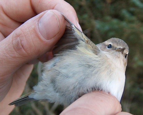 Beskrivelse: fugl 1: Den 8-10-04 fandt jeg denne (tristis) gransanger ved mit ringmærkerkrat, den blev obset en del gange spredt over en time, inden den fløj i et net. Kaldet blev ikke hørt i felten, men mange gange da vi havde den i hånden. Kaldet blev optaget på video. Følgende mål er taget på fuglen: Vinge 55mm Hale 54mm Næb: spids til skull 11,2 mm. spids til nostil 5 mm 1p = 7mm distance 1p til 2p = 22mm 2p= 8 8/9 Hele fuglens underside var lyshvid/buff uden antydning af gult. Ej heller var der, det mindste gult i øjenbrynsstriben. Det eneste gule på fuglen var ved vingeknoen og lidt ind på undervingen, hvilket en tristis også må have. Med fuglen i hånden, var vi enige om at isse, nakke og ryg var ensfarvet brun, kun med grønt på vinger og hale. Kaldet var meget foreneligt med tristiskald på cd’en Eastern Vagrants. Billederne er taget, hvor der er meget sollys på fuglen. Fuglen blev set af Jimmi Skat Hansen, Søren Haaning Nielsen, Ole Vognstoft og John Kyed.
