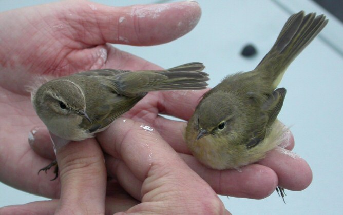 Beskrivelse: Her er billeder af fugl nr. 2 som jeg fangede den 12-10-04 om morgenen. Desværre knap så skarpe billeder, da det var tidlig morgen og ikke ret meget lys til foto. Mål på fuglen: vinge= 57mm næb= spids til skull 11.5mm og nostil til spids 5,2mm hale=46 2p = 8 1p= 6,5mm distance 1p til 2p= 23,5mm Mvh John Kyed